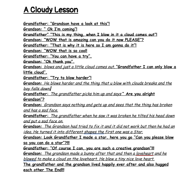 Hello Bloggers welcome back to my blog. Today I am going to be showing you guys some writing it is called A Cloudy Lesson I had to do it for school. It was all about a grandfather and his grandson. I had to watch a silent video and work out what they were saying and doing. I am happy with what I have done.  Here is my writing.